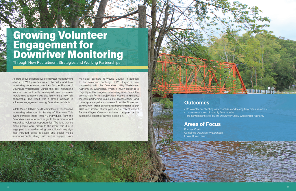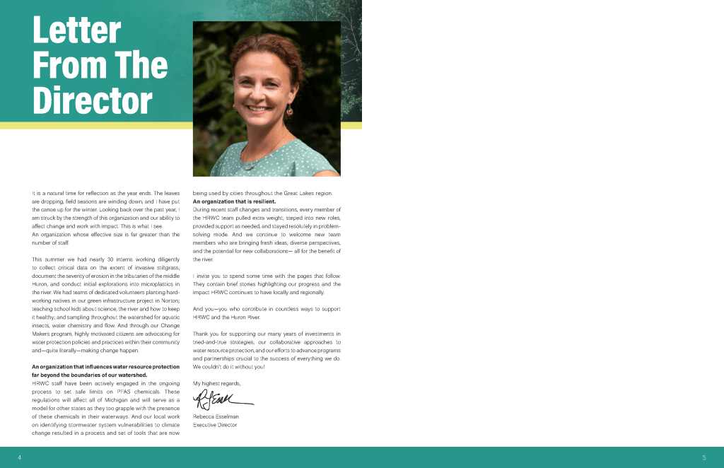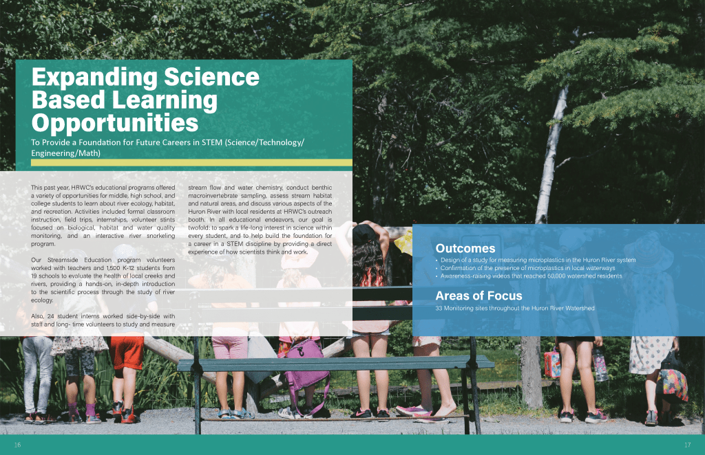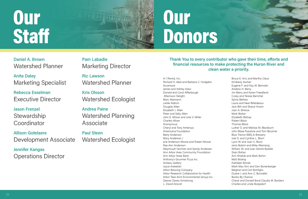 Huron River Watershed Annual Report was a project assigned to me in college. I was tasked with redesigning a new annual report for the HRWC for the 2020-2021 calendar year. I focused on making a streamlined and highly functional publication that would demonstrate my understanding of layout and grid. I think the end product achieved those goals and made a good annual report for an organization with calendars I enjoy on an annual basis.