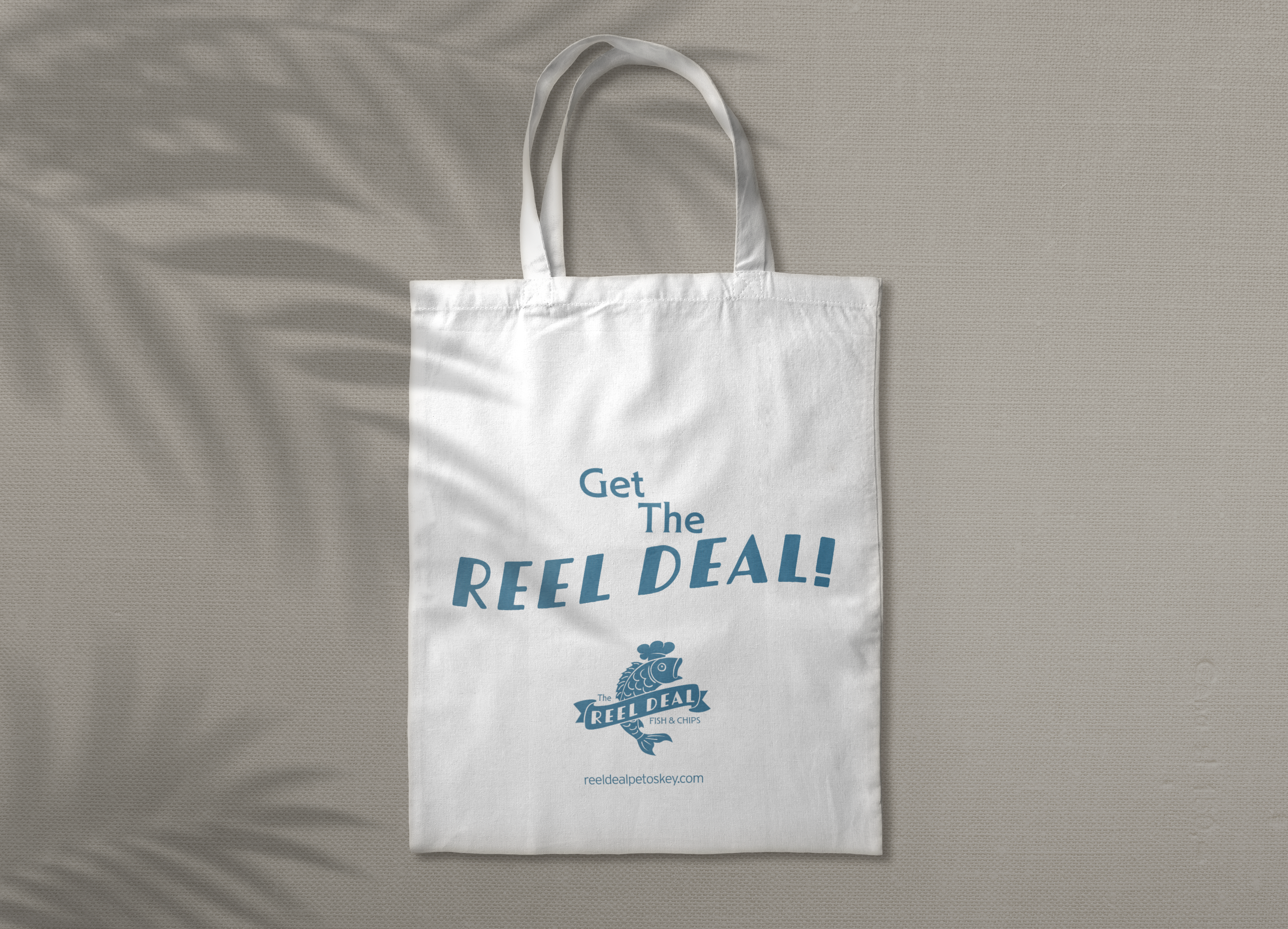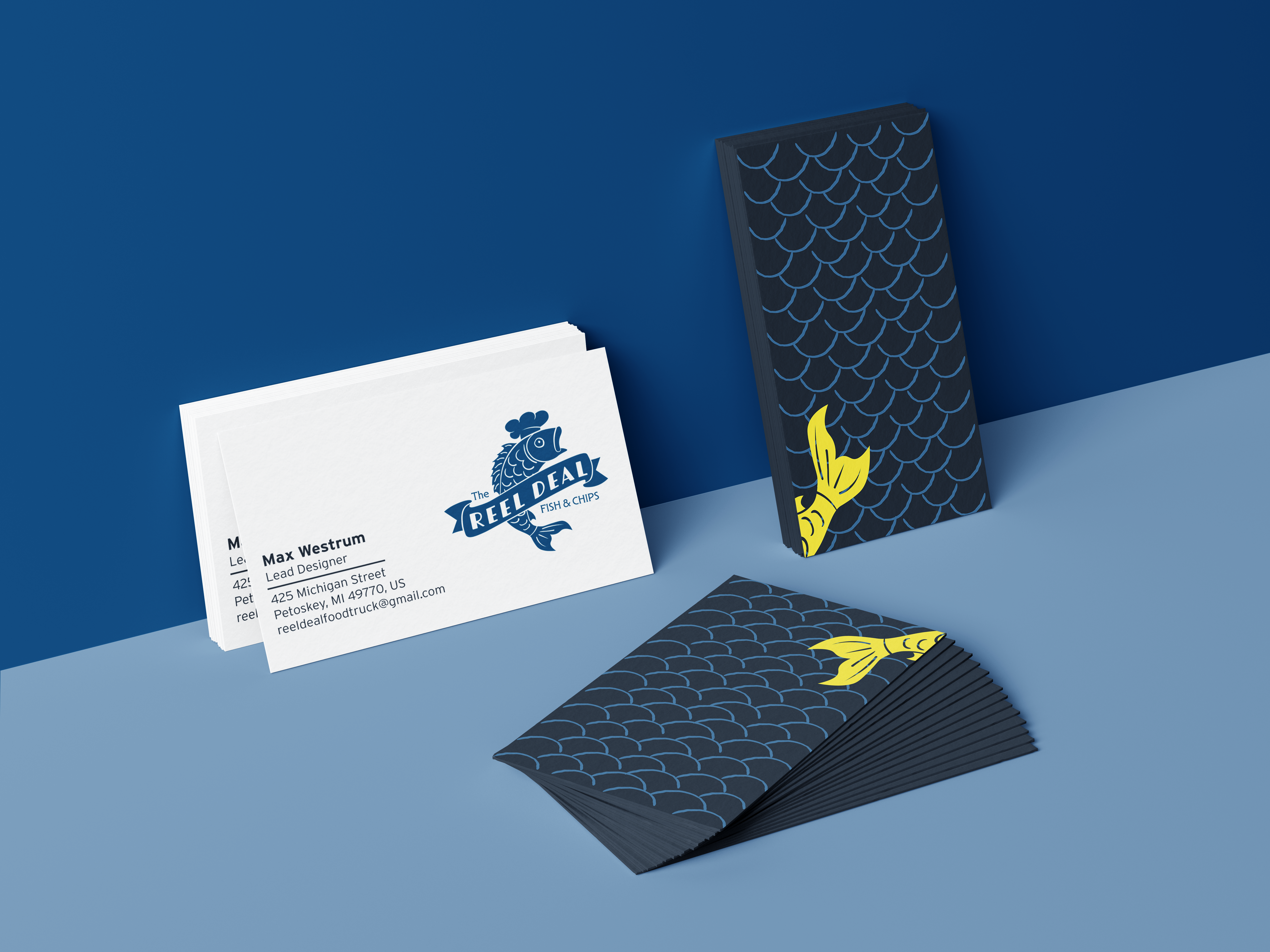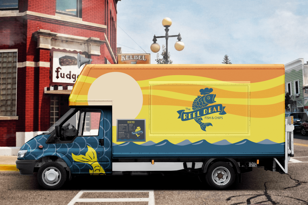 This was a rebranding project assigned to me in college. Reel Deal Fish & Chips is a food truck located in Petoskey, MI. For this project I wanted to aim for a vintage nautical theme fitting for a quality mobile seafood joint. I focused on making a illustrated and sunset-beachy-lakeside-cutesy atmosphere. Being the biggest form of physical advertising real estate, the truck has the most detail and color packed into it, sure to catch the eyes of any peckish food truck peruser. Seeing the end product, I think this is probably one of my best rebrandings yet. I also realized I quite like doing food-related branding projects as it almost always makes me hungry.